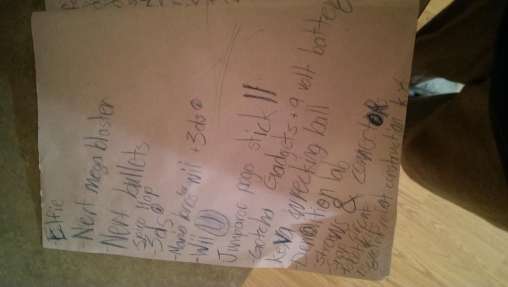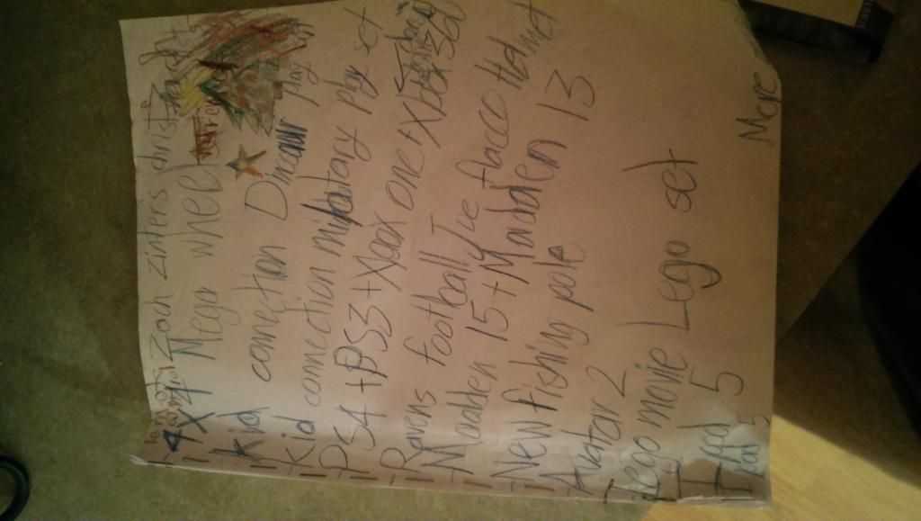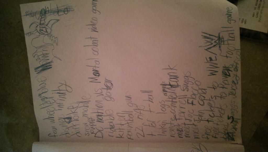 So my wife Steph came to me and says my stepson Zach has started a Xmas list. Meanwhile she has this look while she's explaining it. Icouldn't make out the look on her face. I'm still not sure if it was a worried face, a frantic look, or a omfg face. So here's the list. I see like 30grand easy and he's not finished.