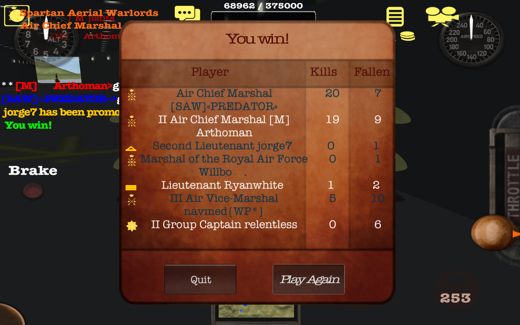I would just like to tell Gotchya good game. Didn't much care for the team mates you had. But good game. It was real fun. Really didn't care that the person that snuck in and bombed our last hangers decided she needed one more kill before the game ended while I was typing gg. But. What the hell. When their name is 420 I guess theyre to high to think straight sometimes.